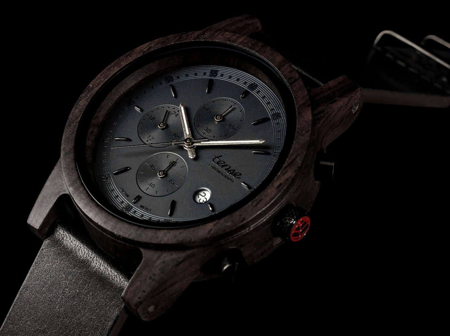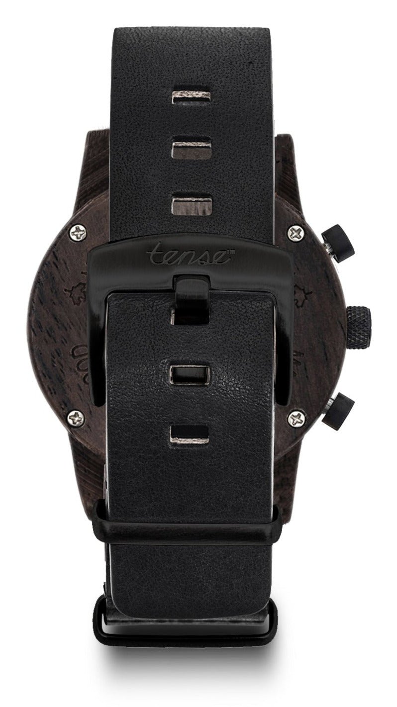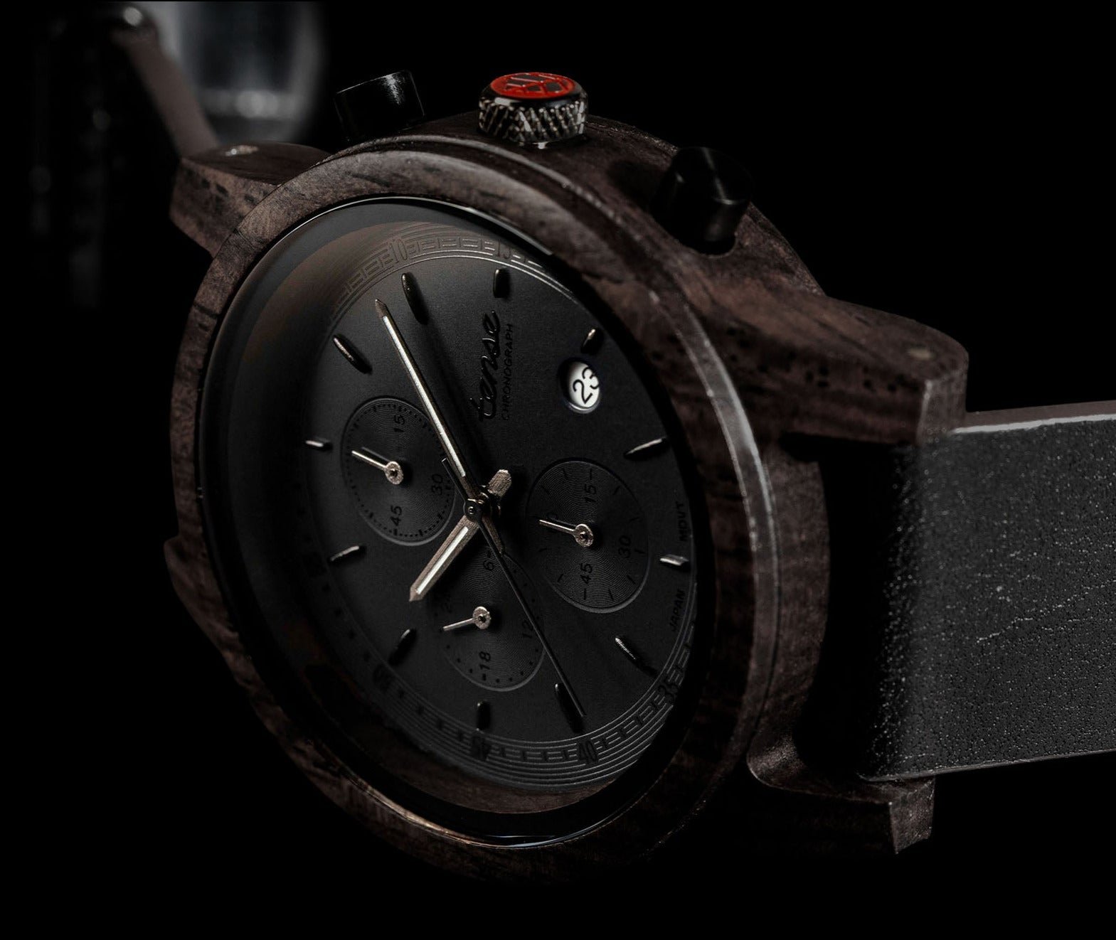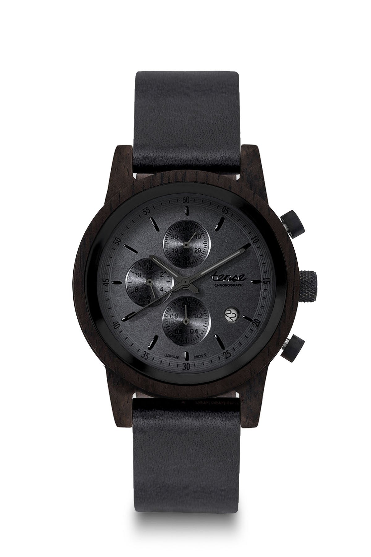 The Cambridge Chrono Leather Blackout features Premium leather straps. This unisex 6-hand chronograph features 3 sub-dials showing the Chrono in minutes. hours and seconds. The Cambridge is made from 100% recycled or reclaimed wood. with Miyota 0S60 watch movement from Japan. and is adjustable in size. With this Miyota movement. the centre Chrono second hand moves only when the Chronograph function is activated.