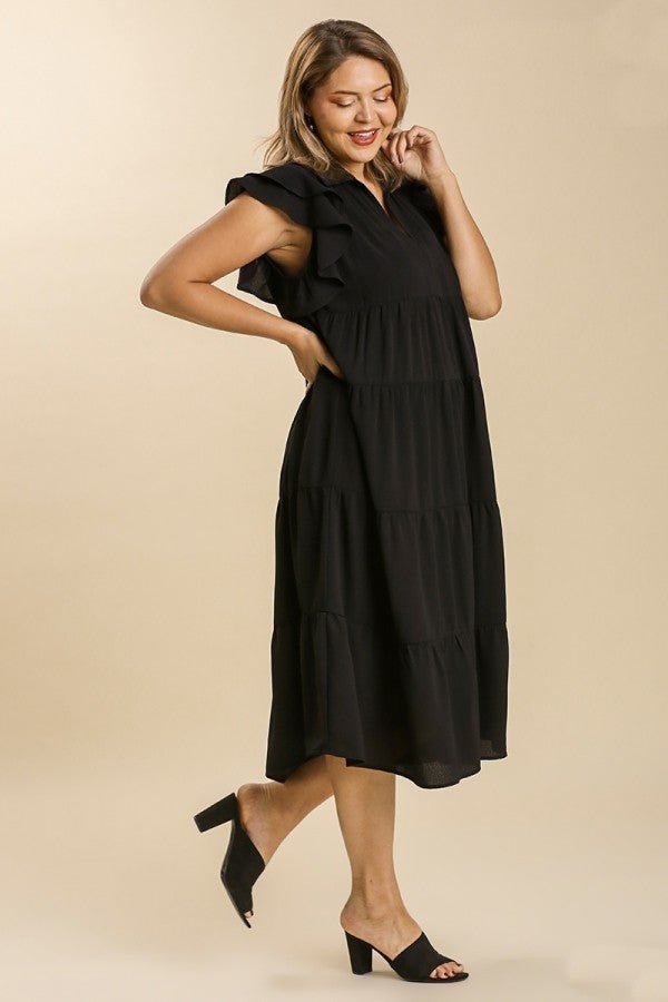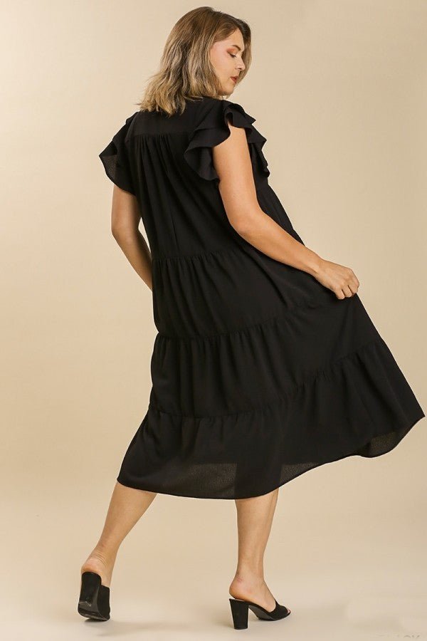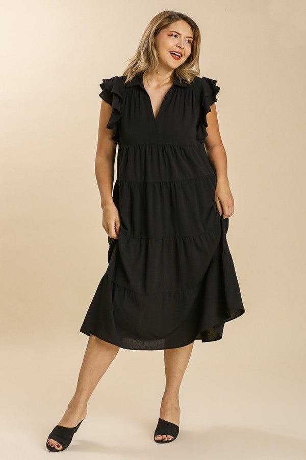 This Umgee dress features a tiered design, midi length, ruffled short sleeves, and a collared split neckline.